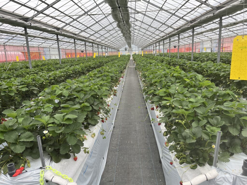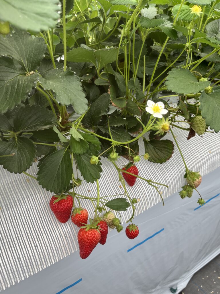 甘利にとって初めてのいちごのハウス栽培ですが、苗の時から当社の資材であるMEGUMI-P1、シーマロックスを使用しております。