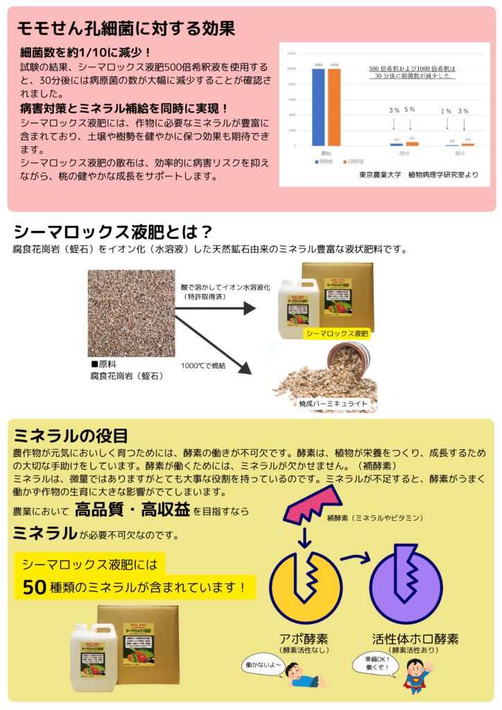 また、モモのせん孔細菌病にも効果が認められており、当管轄の農園でも桃、ぶどう、いちごに使用しており、