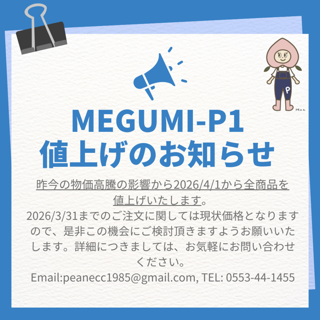 昨今の物価高騰の影響から2026/4/1からMEGUMI-P1全商品を値上げいたします![]()